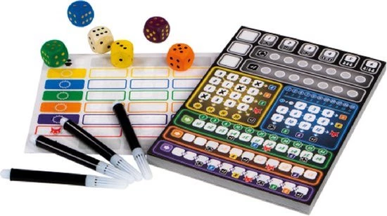 | Verpakkingsinhoud | Inhoud:, 1, scoreblok, 6, dobbelstenen, 4, viltstiften, De, spelregels |