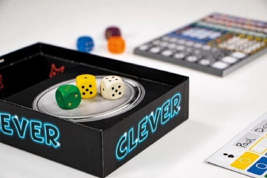 In Clever rol je met dobbelstenen voor punten. Elke dobbelsteen heeft een eigen kleur, die overeenkomt met een categorie op jouw persoonlijke scoreblad. De dobbelsteen die je na het rollen kiest, vul je op het scoreblad in. Elke kleurencategorie geeft punten op een eigen manier. Zo kruis je met de gele dobbelsteen vakjes aan in de gele categorie en vul je de waarde van de oranje dobbelsteen in bij de lege vakjes van de oranje categorie. Per beurt moet je drie keer rollen, waarna je telkens ????n dobbelsteen kiest. Elke lagere dobbelsteen dan degene die je kiest gaat naar het dienblad, waardoor de tegenspelers tijdens jouw beurt gebruik van deze dobbelsteen mogen maken. Hoe slimmer je kiest, hoe meer kans je hebt op het cre??ren van kettingreacties. Een paars vakje dat je invult kan een bonus geven waarmee je ook een geel vakje aan mag kruisen, waardoor misschien een tweede bonus in werking gaat die je een blauw vakje laat afvinken. Door zo de meeste clevere combo???s op te zetten behaal je de hoogste scores!