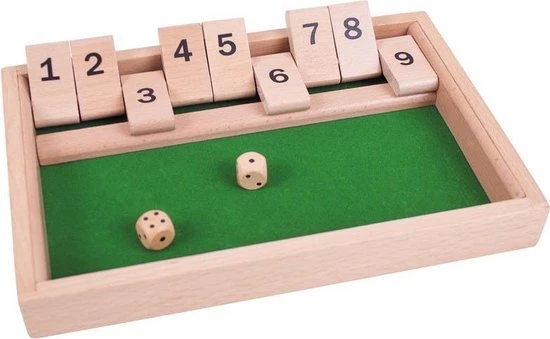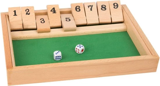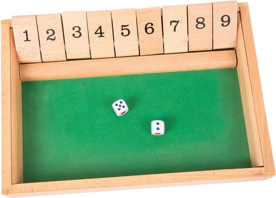 Het beroemde shut the box, oftewel doe de deur dicht, waarbij je met de dobbelsteen moet gooien en moet proberen alle luikjes te sluiten. Heel goed te spelen om goed te leren tellen.