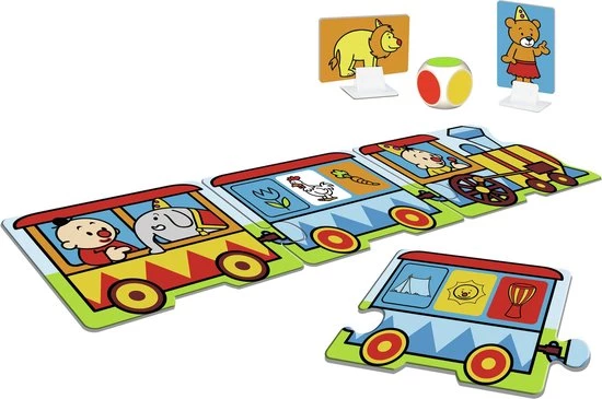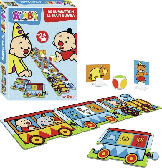 Ga je mee op reis met de Bumbatrein? Puzzel de wagonnetjes aan elkaar en maak elke keer een nieuw spelbord. Dobbel je een weg door de Bumbatrein. Met de kleurendobbelsteen weet je meteen naar welk vakje je mag springen. De eerste speler die bij Bumba kan geraken is de winnaar van het spel!