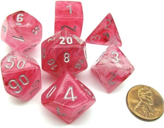 Een set van zeven Chessex dobbelstenen in het donker oplichtend half transparant roze, met zilverkleurige opdruk.