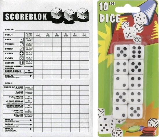 | Verpakkingsinhoud | 2x, yahtzee, blok, 1x, dobbelstenen, (10x) |
