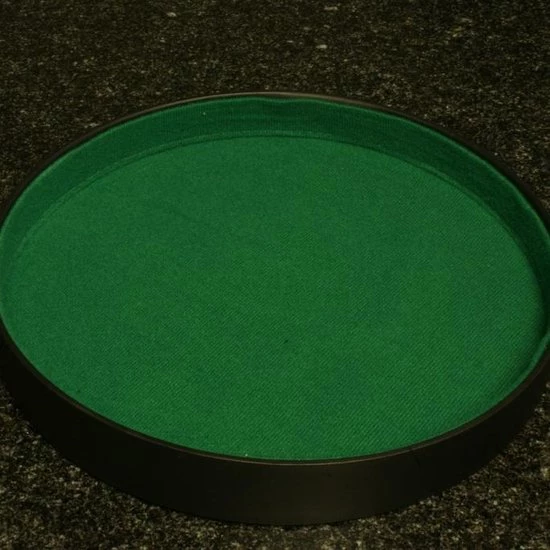 Deze dobbelpiste of dobbelbak maakt het gooien met dobbelstenen niet alleen leuker, maar ook een stuk makkelijker. Want de dobbelstenen rollen nu niet meer van tafel af op de grond. Maar door gebruik te maken van deze dobbelpiste blijven ze gewoon op tafel. De dobbelpiste is 26cm in doorsnee met een zwarte vinyl buitenkant en ingelegd met groen vilt. Dobbelpiste Dobbelbak Rond Zwart Vinyl met Groen Vilt 26cm.