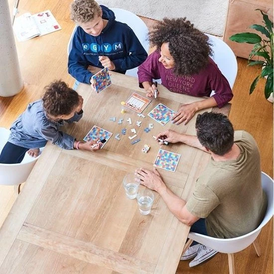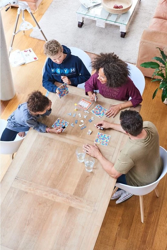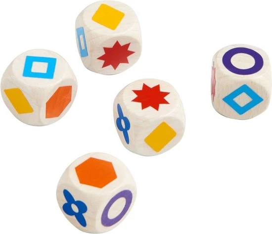 - Inhoud: 5 dobbelstenen, 4 stiften met sponsje, 1 zandloper, 4 dubbelzijdige borden, 1 dubbelzijdig puntenplan/puzzleplan, 12 vormenkaartjes, 1 spelhandleiding.