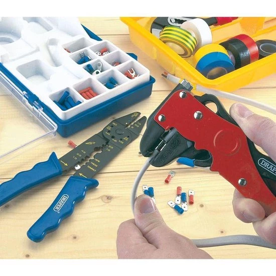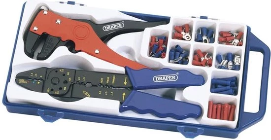 Deze Draper Tools Krimptang en draadstripperset is een ideale professionele gereedschapsset voor het moeiteloos krimpen, strippen en knippen van draden. Deze set bestaat uit krimptang van 230 mm met krimpontstekingsklemmen en een draadstripper van 165 mm, beiden met lichtgewicht stalen behuizingen, een handige draagkoffer en ongeveer 100 kleurgecodeerde, geïsoleerde krimpklemmen in verschillende maten. De krimptang is ook geschikt voor het knippen van draad-, kabel- en nylon bouten en het krimpen van ronde en vierkante niet-geïsoleerde aansluitingen. Dankzij de spanningsregeling zijn de draadstrippers perfect voor het verwijderen van draadisolatie tot een lengte van 14 mm.