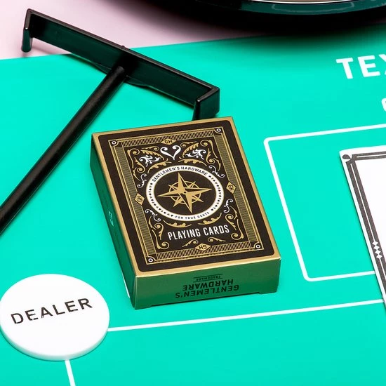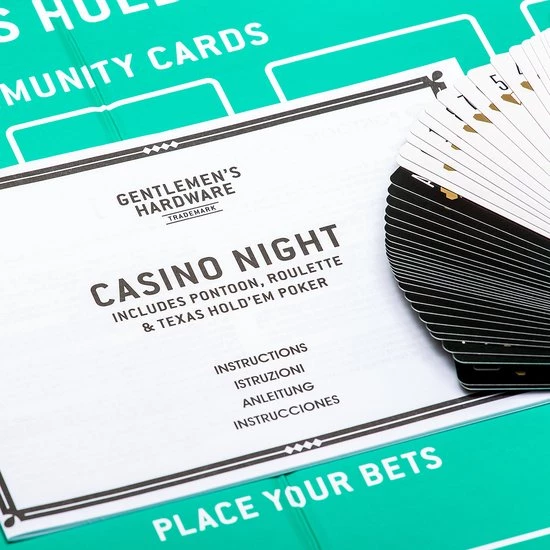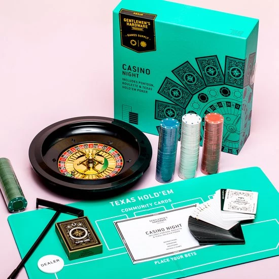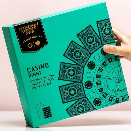 Casino Night spelletjesdoos van Gentlemen?s Hardware. Doos met drie casinospellen. In de doos zit het kaartspel Eenentwintigen en alle benodigdheden voor roulette en Texas hold?em poker. Inhoud: spelbord met roulette en poker kant, twee kaartspellen, 200 chips, dealer munt, croupier stok, roulette wiel en twee roulette ballen. Met instructies voor alle drie de spellen. Perfect voor een casino avond met vrienden. Afmeting: 29 x 29 x 10 centimeter.