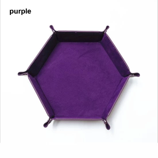 Een nep-lederen dobbelstenenbak met stoffen binnenkant. Beschikbaar in verschillende kleuren. De hoeken zijn met drukknopen dicht te maken om de bak te vormen. Hierdoor is hij ook makkelijk om mee te nemen of op te bergen. De kleine dobbelstenenbak is ongeveer 17.5cm bij 17.5cm.