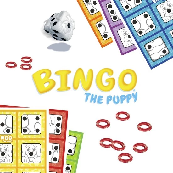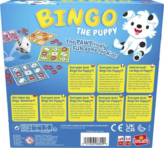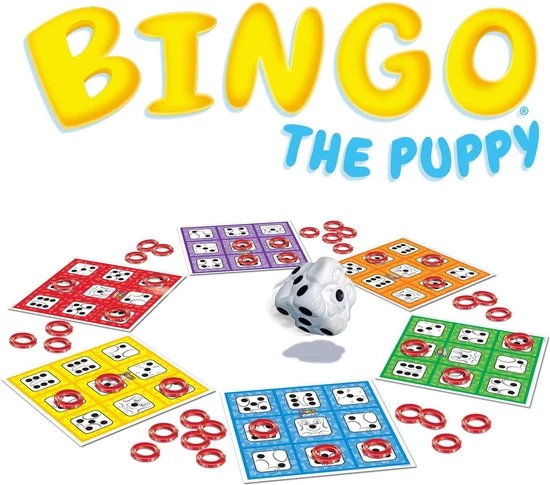 Een blaftastisch leuke variant op bingo voor kinderen. Dobbel met de schattige hondendobbelsteen en leg een ringetje bij de gegooide stippen. Degene die het eerst drie op een rij heeft wint! Dobbel met de schattige hondendobbelsteen en leg een ringetje bij de gegooide stippen. Degene die het eerst drie op een rij heeft wint! Kinderen vanaf 3 jaar zullen met dit spel cijfers leren lezen.