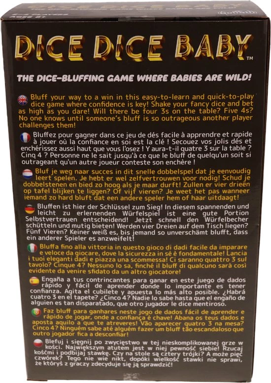 Misleid je vrienden om te voorkomen dat ze je bod uitdagen, maar blijf goed opletten, zodat je hen op het juist moment op een bluf kunt betrappen. Als je de laatste speler bent die minimaal ??n dobbelsteen overheeft, dan heb je het spel gewonnen! Dice Dice Baby is het ideale spel om te spelen met het gezin of met vrienden. Daag elkaar uit en zet je beste pokerface op!