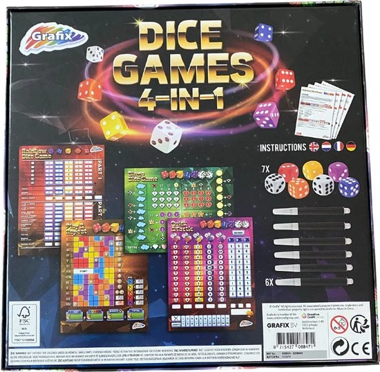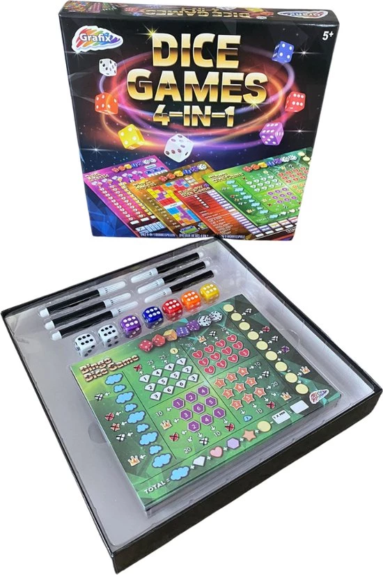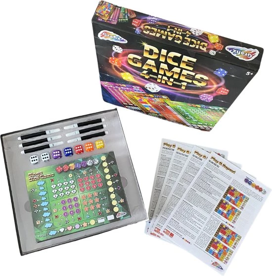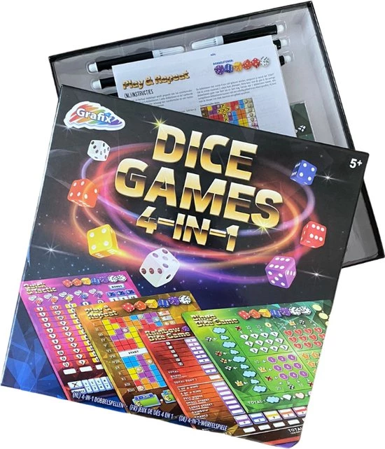 - Uren speelplezier met dit 4-in-1 dobbelsteenspel.
