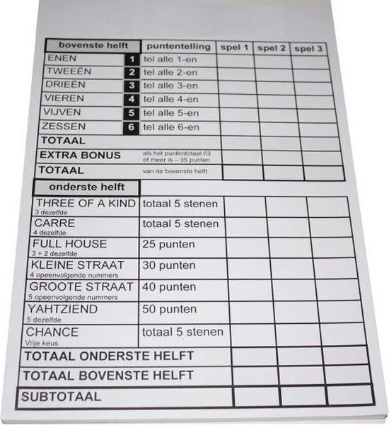 Er zitten 3 spellen per bladzijde op het grootletter yahtzee scoreblok
