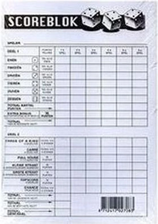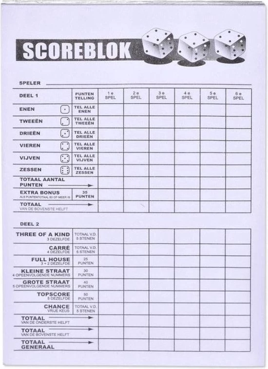 Twee scoreblokken Yahtzee, inclusief 12 dobbelstenen. 2x scoreblok Yahtzee met 100 vellen. Formaat: ongeveer 15 x 10,5 cm. Scoreblok om uw punten bij te houden met het spelletje Yahtzee. bestaande uit 2x Dobbelstenen 6 stuks, 2x Scoreblok Yahtzee 100 vellen