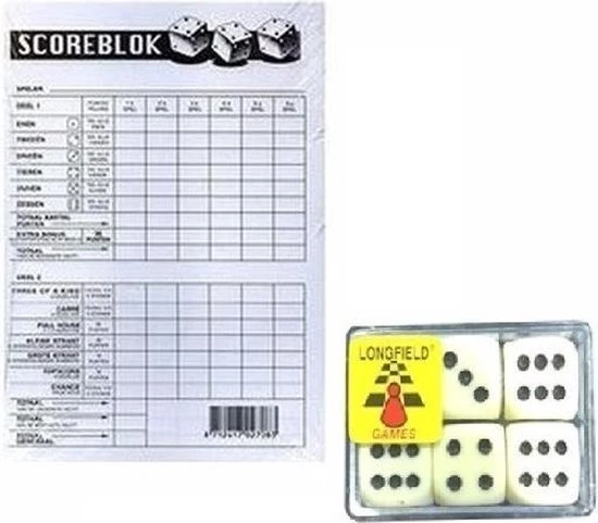Yahtzee spelletje. Scoreblok Yahtzee met 100 vellen inclusief 6 dobbelstenen. Formaat Yahtzeeblok: ongeveer 15 x 10,5 cm. bestaande uit 1x Dobbelstenen 6 stuks, 1x Scoreblok Yahtzee 100 vellen