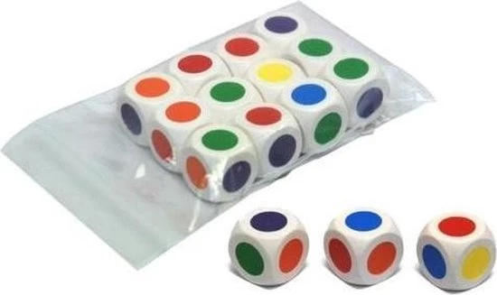 Kleurdobbelstenen, 30 mm. Wit gelakte houten dobbelsteen. Met de kleuren geel, oranje, rood, groen, blauw, paars. Per 6 geleverd.