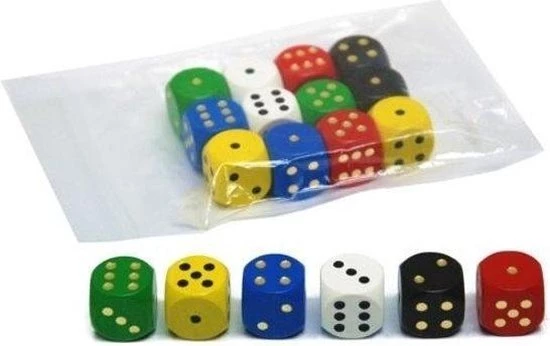 Dobbelstenen hout 6 kleuren assortie, 20 mm. wit / geel / rood / groen / blauw en zwart. Geproduceerd in Duitsland
