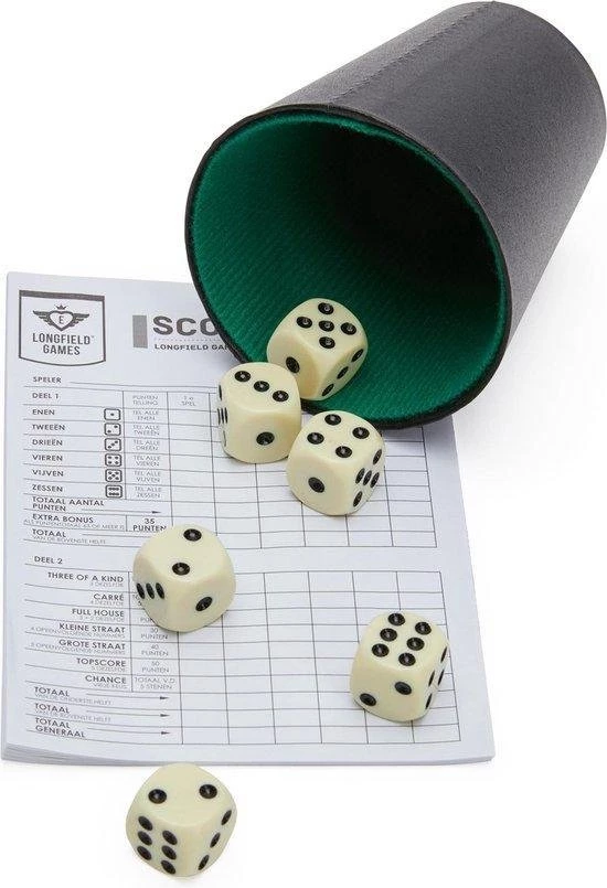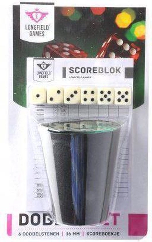 deze dobbelset bestaat uit een dobbelbeker met 6 dobbelstenen van 16 mm en een dobbelblok om je score bij te houden.