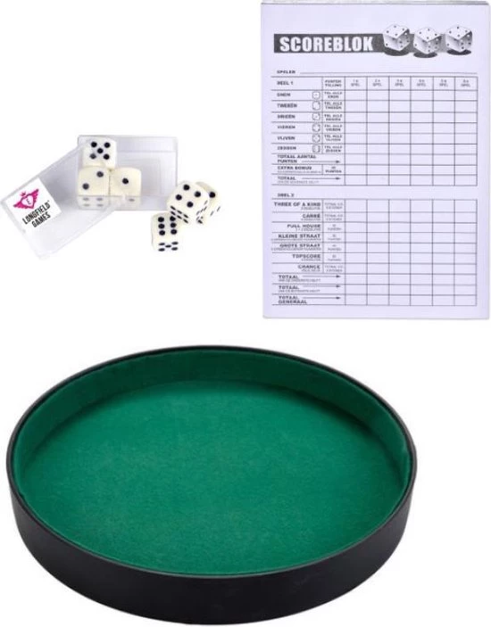 Dit dobbelbord is ideaal voor het spelen van diverse dobbelspellen . Compleet met 6 dobbelstenen en een scoreblokje. De pokerpiste heeft een diameter van 26 cm. Is gemaakt van kunstleder (zwart ) en heeft een groene binnenvoering. De dobbelstenen, 6 in een doosje hebben een afmeting van 16 mm (ivoorkleurig).