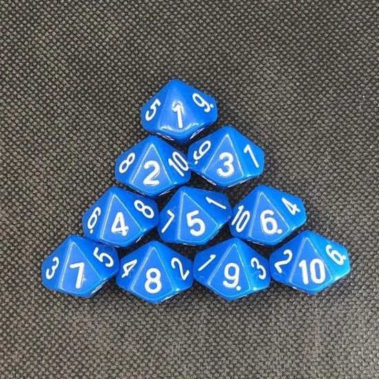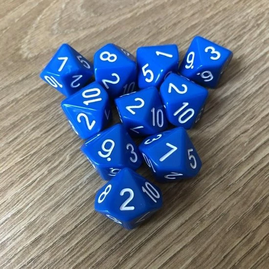 Dobbelstenen met 10 zijden, blauw. Hij bevat de cijfers 1-10!