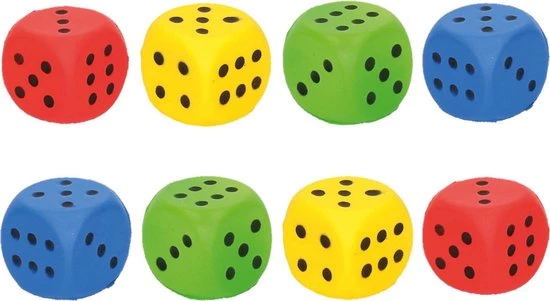 Set van 8x stuks speelgoed foam dobbelstenen van 4 x 4 cm. U ontvangt 4x kleuren, van elke kleur 2x. Creeer je eigen dobbelspel. bestaande uit 2x Foam dobbelsteen rood 4 x 4 cm, 2x Foam dobbelsteen blauw 4 x 4 cm, 2x Foam dobbelsteen groen 4 x 4 cm, 2x Foam dobbelsteen geel 4 x 4 cm