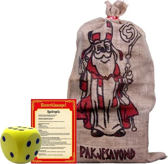Sinterklaasspel met gele dobbelsteen en jute cadeauzak 60 x 102 cm. Onmisbaar tijdens pakjesavond zodra de kinderen niet meer geloven in Sinterklaas en zijn Pieten: het Sinterklaasspel/pakjesspel. In deze startset ontvangt u: 1x Sinterklaasspel spelregels, 1x foam dobbelsteen en 1x jute cadeauzak met opdruk van de Goedheiligman en de tekst: PAKJESAVOND.