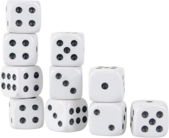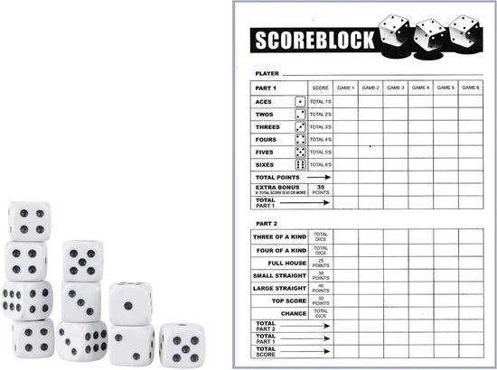 Compleet Yahtzee spel inclusief scoreblok en 10 witte dobbelstenen. U speelt natuurlijk het spel met 5 dobbelstenen, maar met deze set heeft u altijd een extra set dobbelstenen achter de hand voor als u een dobbelsteen kwijtraakt. Of als extra set te gebruiken.