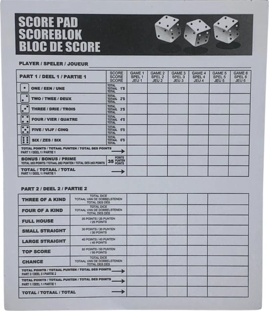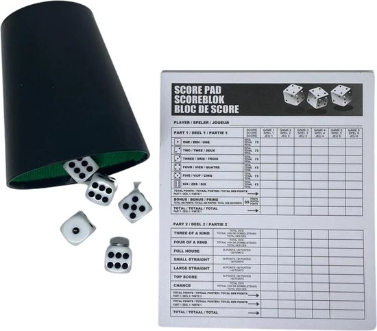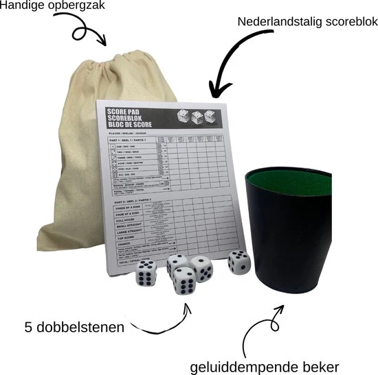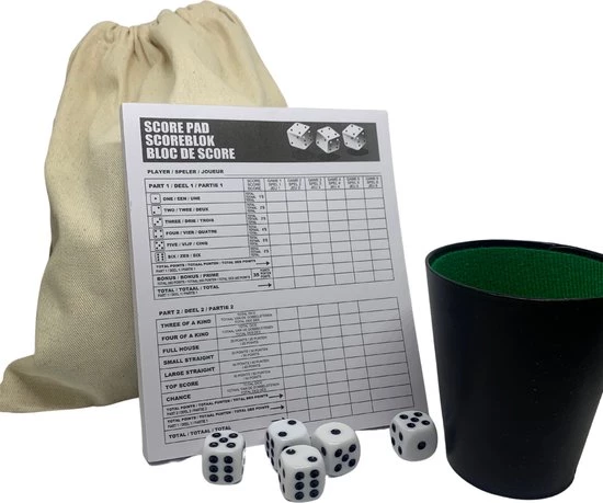 Hiervoor hebben wij natuurlijk een mooie oplossing gevonden, wij verkopen Yathzee met een Nederlands scoreblok met wel 100 vellen, 5 dobbelstenen, een gooibeker en met een handige opbergzak. Hierdoor kan je altijd alle attributen op 1 plek houden en kan je er mee reizen. Naar een verjaardag, vergeet je Yathzee niet. Yathzee meenemen was nooit zo gemakkelijk! Attributen raak je niet kwijt en hierdoor kan je nog langer genieten van je Yathzee set.