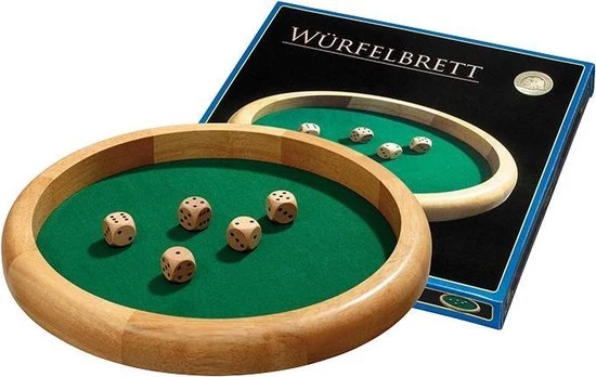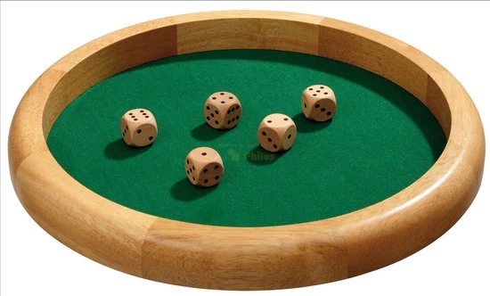 Dobbelpiste Blank Hout XL 40 cm. Rand 4 cm hoog 2.6 cm breed. Met groen vilt inclusief 5 x dobbelsteen van blank hout 25 mm. verpakt in fotodoos.