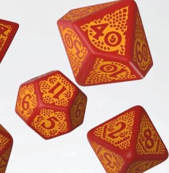 Een set van zeven Q-Workshop dobbelstenen, rood met oranje opdruk in een drakenschubben thema.