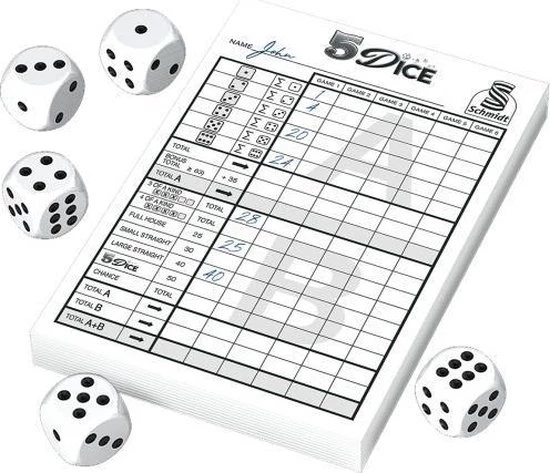 | Verpakkingsinhoud | Inhoud:, 5, dobbelstenen, 1, scoreblok, De, spelregels |
