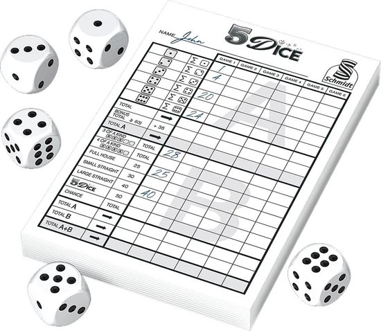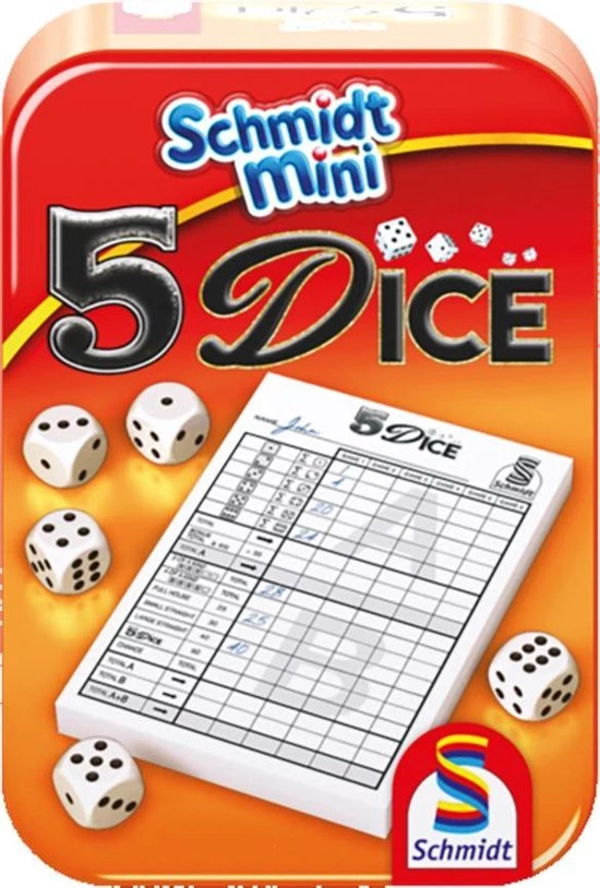 De miniversie van het bekende dobbelspel. Iedere speler probeert zoveel mogelijk punten te scoren met het dobbelen van combinaties zoals “3 of a kind”, “Full house” of “5Dice!”. Gelijke cijfers leveren ook punten op en wellicht zelfs een bonus. 5Dice is ??n van de spelletjes in de Schmidt Mini-serie, een aantal bekende klassiekers in miniformaat. Kleine spelletjes voor in de jaszak of de reisbagage worden steeds populairder. Door deze compacte edities kun je nu altijd en overal je favoriete spellen spelen!
