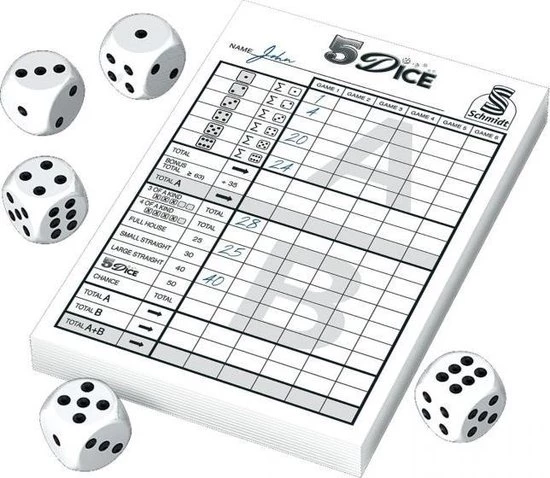 Iedere speler probeert zoveel mogelijk punten te scoren met het dobbelen van combinaties zoals “3 of a kind”, “Full house” of “5Dice!”. Gelijke cijfers leveren ook punten op en wellicht zelfs een bonus. 5Dice is een van de spelletjes in de Schmidt Mini-serie, een aantal bekende klassiekers in miniformaat, een aantal bekende klassiekers in miniformaat. Ideaal om bij je te hebben op kamp of vakantie