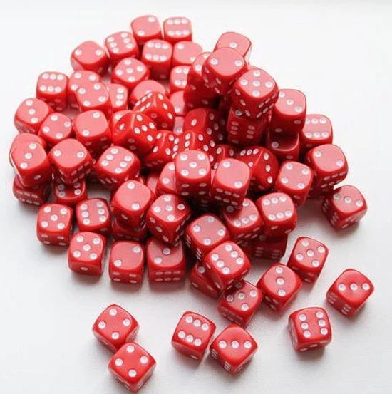 Kunststof dobbelsteen met normale stippen en een afmeting van 16mm in de kleur rood. De rode dobbelstenen zijn verpakt in een zak van 100 stuks.
