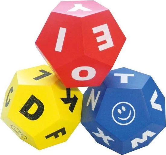 Set van drie dobbelstenen met 12 zijdes voorzien van letters en één smiley. Door de dobbelsteen te gooien komt er een letter boven te liggen waarmee spelenderwijs opdrachten kunnen worden gegeven voor de taalontwikkeling en diverse spellen.