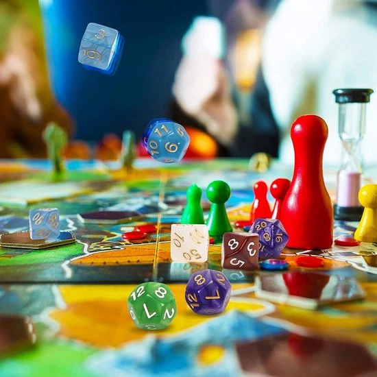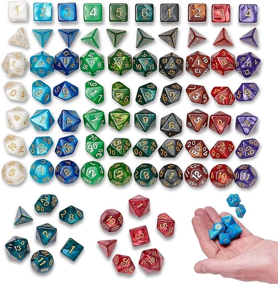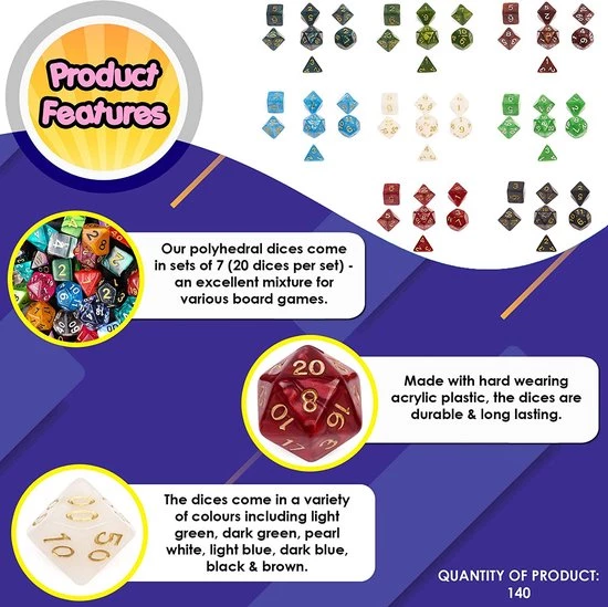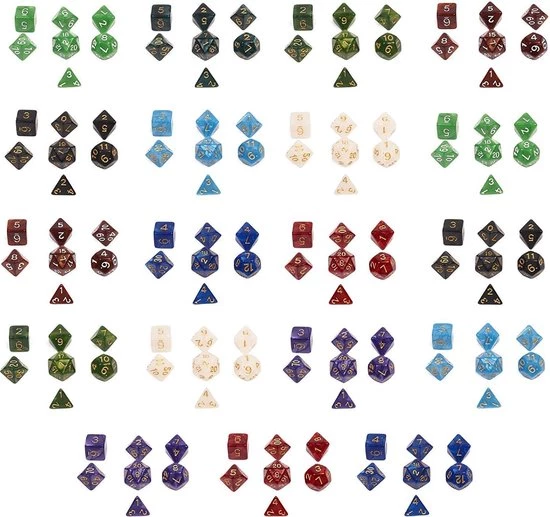 Deze mooie Dungeons & Dragons dobbelstenen van The Twiddlers zijn perfect om veel verschillende spellen mee te kunnen spelen! De dobbelstenen zijn onder andere geschikt voor het spelen van bordspellen, Yahtzee en Dungeons & Dragons en worden geleverd in sets van zeven stuks. In ??n setje zitten zeven dubbelstenen: D4, D6, D8, D10 (00-90), D10 (0-9), D12 en D20. De dobbelstenen zijn gemaakt van stevig en kleurvast acryl, waardoor ze duurzaam zijn en lang meekunnen. Deze set bestaat uit 140 stuks met allerlei verschillende prachtig gekleurde varianten.