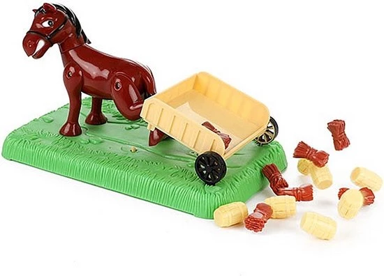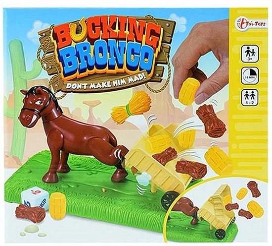 Toi-Toys Bucking Bronco dobbelspel. Maak het paard niet kwaad anders schopt hij de kar omver! Geschikt voor 2 spelers vanaf 3 jaar.