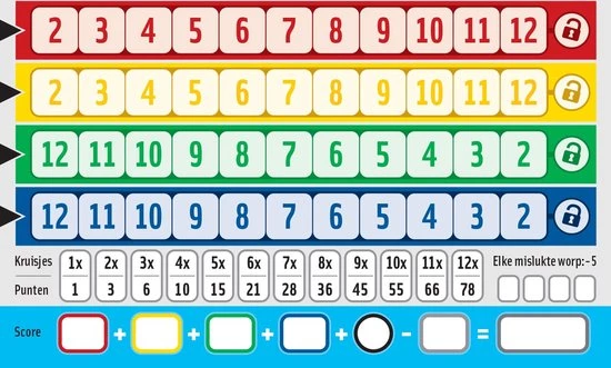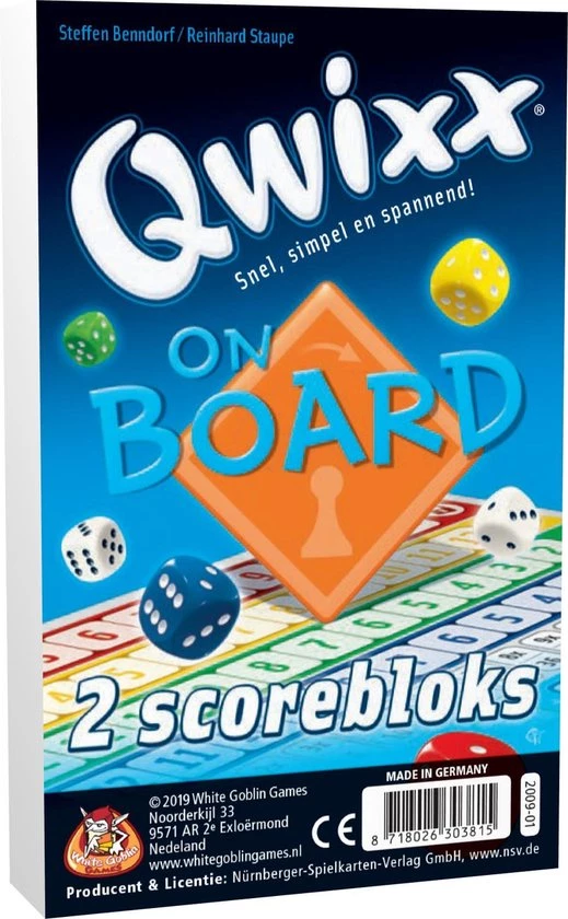 Het Qwixx On Board dobbelspel bestaat uit twee extra scoreblokken met 80 blaadjes per stuk (160 in totaal) voor het populaire dobbelspel Qwixx On Board.